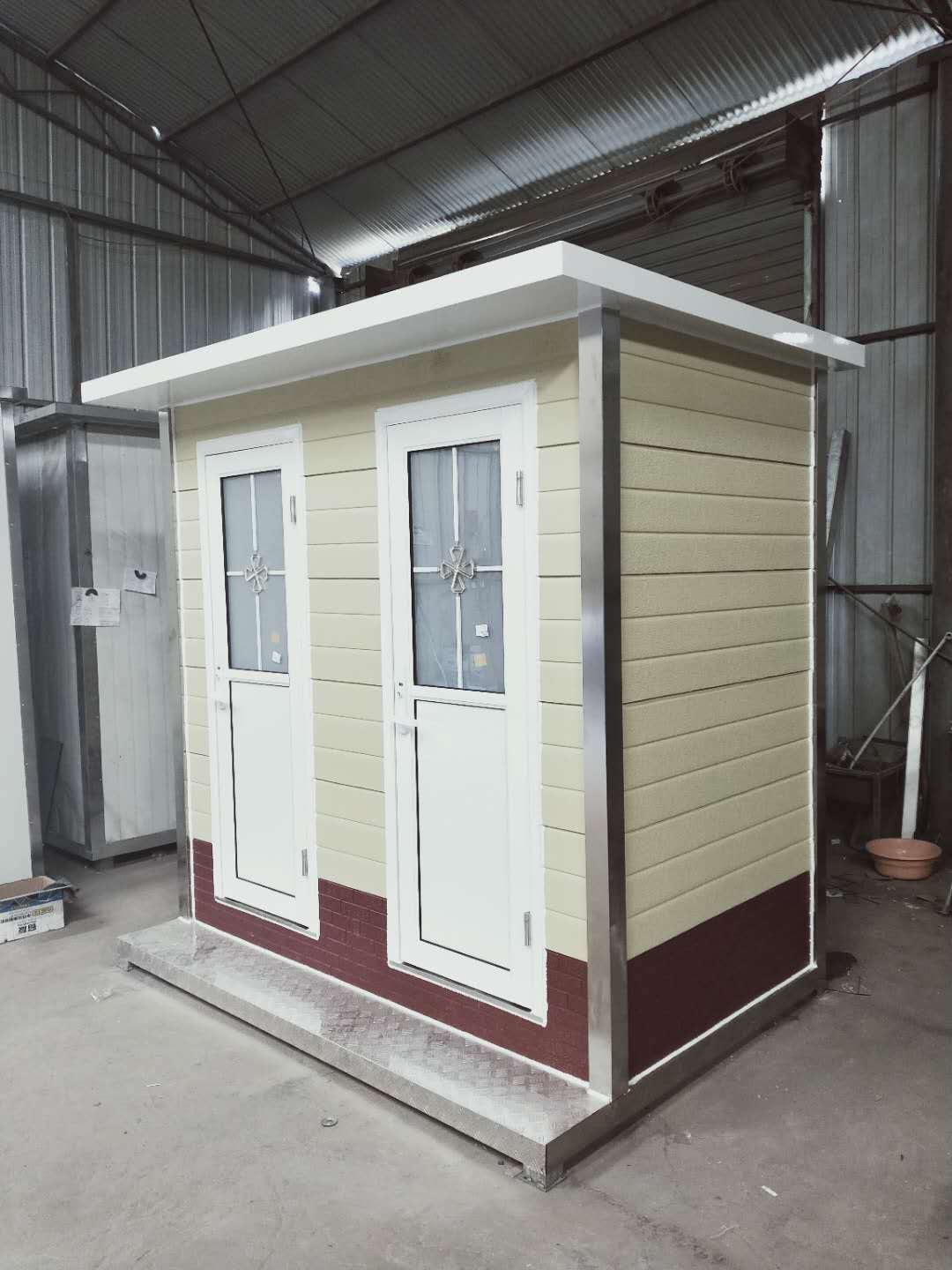 簡(jiǎn)介—— 2020新款鋼構(gòu)金屬雕花板衛(wèi)生間,水沖式廁所,移動(dòng)方便,環(huán)保干凈。